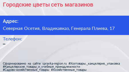 Городские цветы, сеть магазинов по адресу Северная Осетия, Владикавказ, Генерала Плиева, 17 в дальнейшем Организация, размещена в следующих категориях: