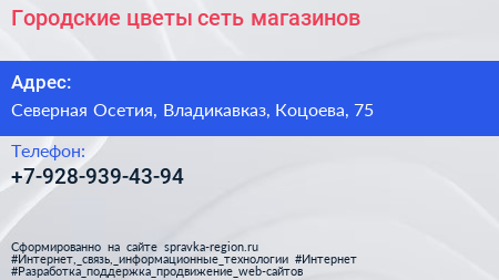 Городские цветы, сеть магазинов по адресу Северная Осетия, Владикавказ, Коцоева, 75 в дальнейшем Организация, размещена в следующих категориях: