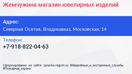 Жемчужина, магазин ювелирных изделий по адресу Северная Осетия, Владикавказ, Московская, 14 в дальнейшем Организация, размещена в следующих категориях: