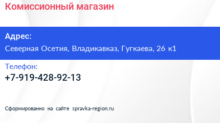 Комиссионный магазин по адресу Северная Осетия, Владикавказ, Гугкаева, 26 к1 в дальнейшем Организация, размещена в следующих категориях: