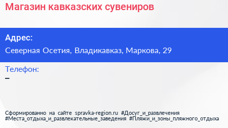 Магазин кавказских сувениров по адресу Северная Осетия, Владикавказ, Маркова, 29 в дальнейшем Организация, размещена в следующих категориях: