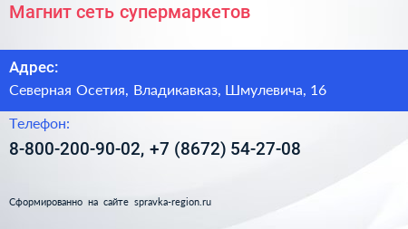 Магнит, сеть супермаркетов по адресу Северная Осетия, Владикавказ, Шмулевича, 16 в дальнейшем Организация, размещена в следующих категориях: