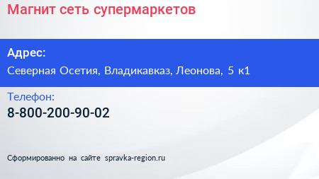 Магнит, сеть супермаркетов по адресу Северная Осетия, Владикавказ, Леонова, 5 к1 в дальнейшем Организация, размещена в следующих категориях: