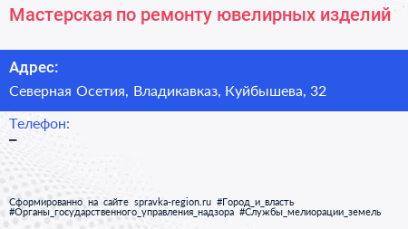 Мастерская по ремонту ювелирных изделий по адресу Северная Осетия, Владикавказ, Куйбышева, 32 в дальнейшем Организация, размещена в следующих категориях: