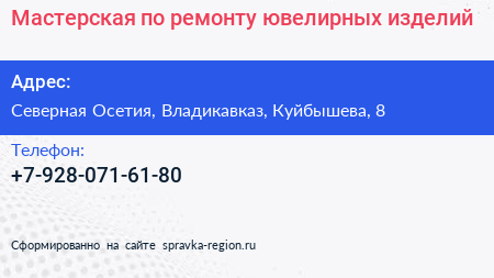Мастерская по ремонту ювелирных изделий по адресу Северная Осетия, Владикавказ, Куйбышева, 8 в дальнейшем Организация, размещена в следующих категориях: