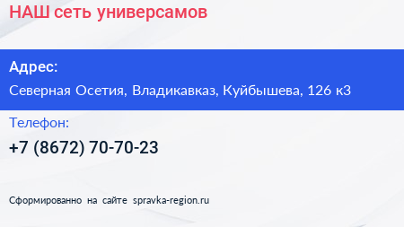 НАШ, сеть универсамов по адресу Северная Осетия, Владикавказ, Куйбышева, 126 к3 в дальнейшем Организация, размещена в следующих категориях: