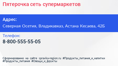 Пятерочка, сеть супермаркетов по адресу Северная Осетия, Владикавказ, Астана Кесаева, 42Б в дальнейшем Организация, размещена в следующих категориях: