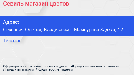 Севиль, магазин цветов по адресу Северная Осетия, Владикавказ, Мамсурова Хаджи, 12 в дальнейшем Организация, размещена в следующих категориях: