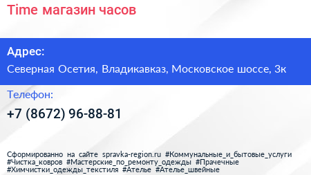 Time, магазин часов по адресу Северная Осетия, Владикавказ, Московское шоссе, 3к в дальнейшем Организация, размещена в следующих категориях: