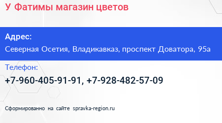 У Фатимы, магазин цветов по адресу Северная Осетия, Владикавказ, проспект Доватора, 95а в дальнейшем Организация, размещена в следующих категориях:
