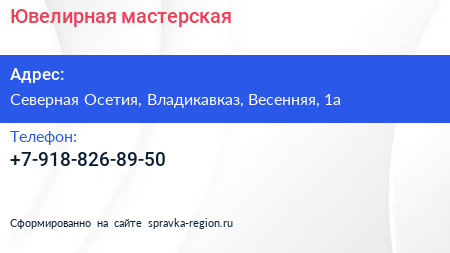 Ювелирная мастерская по адресу Северная Осетия, Владикавказ, Весенняя, 1а в дальнейшем Организация, размещена в следующих категориях: