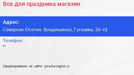 Все для праздника, магазин по адресу Северная Осетия, Владикавказ, Гугкаева, 26 к1 в дальнейшем Организация, размещена в следующих категориях: