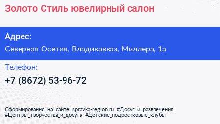 Золото & Стиль, ювелирный салон по адресу Северная Осетия, Владикавказ, Миллера, 1а в дальнейшем Организация, размещена в следующих категориях: