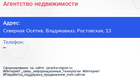 Агентство недвижимости по адресу Северная Осетия, Владикавказ, Ростовская, 13 в дальнейшем Организация, размещена в следующих категориях: