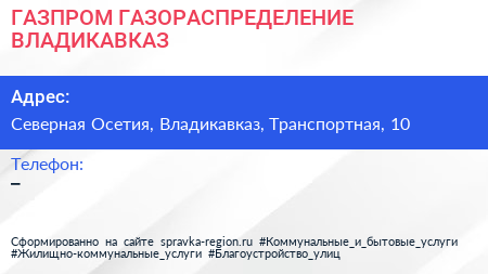 ГАЗПРОМ ГАЗОРАСПРЕДЕЛЕНИЕ ВЛАДИКАВКАЗ по адресу Северная Осетия, Владикавказ, Транспортная, 10 в дальнейшем Организация, размещена в следующих категориях: