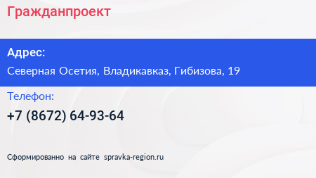 Гражданпроект по адресу Северная Осетия, Владикавказ, Гибизова, 19 в дальнейшем Организация, размещена в следующих категориях:
