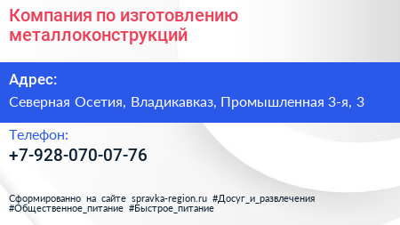 Компания по изготовлению металлоконструкций по адресу Северная Осетия, Владикавказ, Промышленная 3-я, 3 в дальнейшем Организация, размещена в следующих категориях: