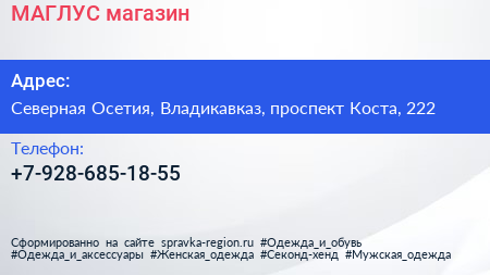 МАГЛУС, магазин по адресу Северная Осетия, Владикавказ, проспект Коста, 222 в дальнейшем Организация, размещена в следующих категориях: