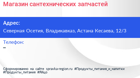 Магазин сантехнических запчастей по адресу Северная Осетия, Владикавказ, Астана Кесаева, 12/3 в дальнейшем Организация, размещена в следующих категориях:
