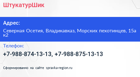 ШтукатурШик по адресу Северная Осетия, Владикавказ, Морских пехотинцев, 15а к2 в дальнейшем Организация, размещена в следующих категориях: