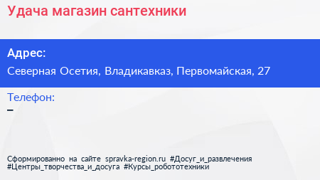 Удача, магазин сантехники по адресу Северная Осетия, Владикавказ, Первомайская, 27 в дальнейшем Организация, размещена в следующих категориях: