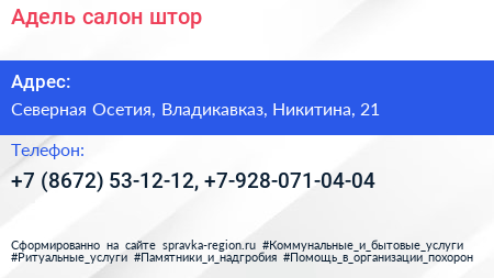 Адель, салон штор по адресу Северная Осетия, Владикавказ, Никитина, 21 в дальнейшем Организация, размещена в следующих категориях: