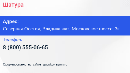 Шатура по адресу Северная Осетия, Владикавказ, Московское шоссе, 3к в дальнейшем Организация, размещена в следующих категориях: