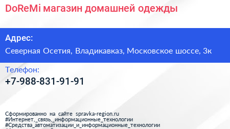 DoReMi, магазин домашней одежды по адресу Северная Осетия, Владикавказ, Московское шоссе, 3к в дальнейшем Организация, размещена в следующих категориях: