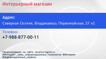 Интерьерный магазин по адресу Северная Осетия, Владикавказ, Первомайская, 27 к1 в дальнейшем Организация, размещена в следующих категориях: