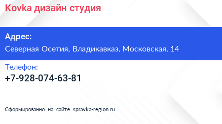 Kovka, дизайн-студия по адресу Северная Осетия, Владикавказ, Московская, 14 в дальнейшем Организация, размещена в следующих категориях: