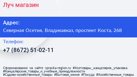 Луч, магазин по адресу Северная Осетия, Владикавказ, проспект Коста, 268 в дальнейшем Организация, размещена в следующих категориях: