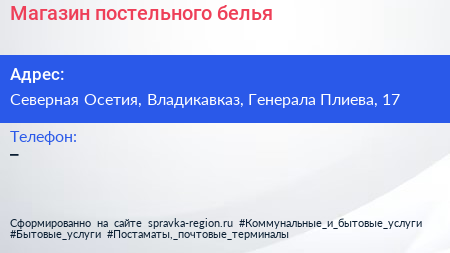 Магазин постельного белья по адресу Северная Осетия, Владикавказ, Генерала Плиева, 17 в дальнейшем Организация, размещена в следующих категориях: