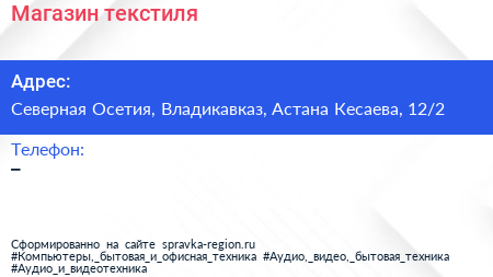 Магазин текстиля по адресу Северная Осетия, Владикавказ, Астана Кесаева, 12/2 в дальнейшем Организация, размещена в следующих категориях:
