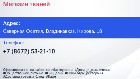 Магазин тканей по адресу Северная Осетия, Владикавказ, Кирова, 18 в дальнейшем Организация, размещена в следующих категориях: