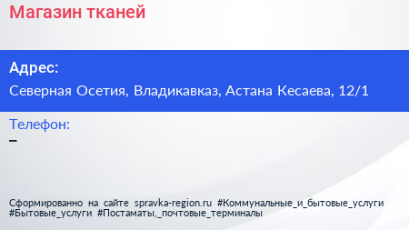 Магазин тканей по адресу Северная Осетия, Владикавказ, Астана Кесаева, 12/1 в дальнейшем Организация, размещена в следующих категориях: