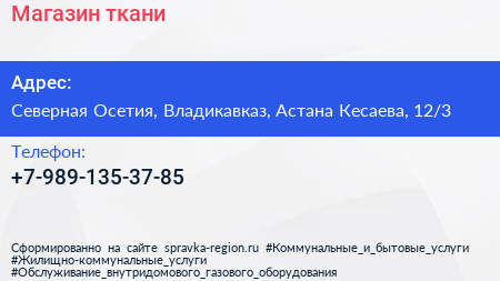 Магазин ткани по адресу Северная Осетия, Владикавказ, Астана Кесаева, 12/3 в дальнейшем Организация, размещена в следующих категориях: