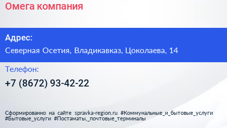 Омега, компания по адресу Северная Осетия, Владикавказ, Цоколаева, 14 в дальнейшем Организация, размещена в следующих категориях: