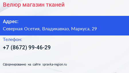 Велюр, магазин тканей по адресу Северная Осетия, Владикавказ, Маркуса, 29 в дальнейшем Организация, размещена в следующих категориях: