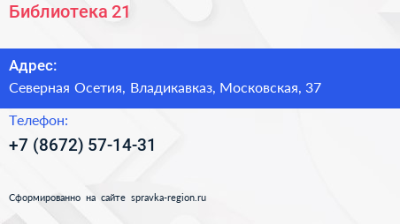Библиотека №21 по адресу Северная Осетия, Владикавказ, Московская, 37 в дальнейшем Организация, размещена в следующих категориях: