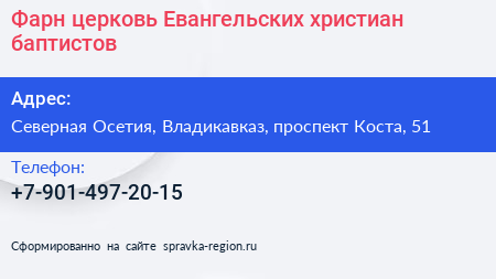 Фарн, церковь Евангельских христиан баптистов по адресу Северная Осетия, Владикавказ, проспект Коста, 51 в дальнейшем Организация, размещена в следующих категориях: