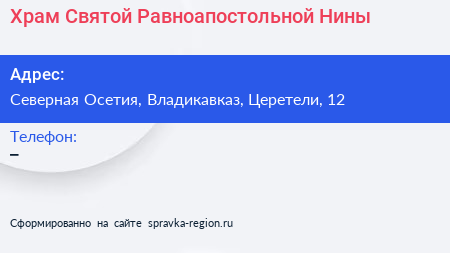 Храм Святой Равноапостольной Нины по адресу Северная Осетия, Владикавказ, Церетели, 12 в дальнейшем Организация, размещена в следующих категориях:
