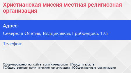 Христианская миссия, местная религиозная организация по адресу Северная Осетия, Владикавказ, Грибоедова, 17а в дальнейшем Организация, размещена в следующих категориях: