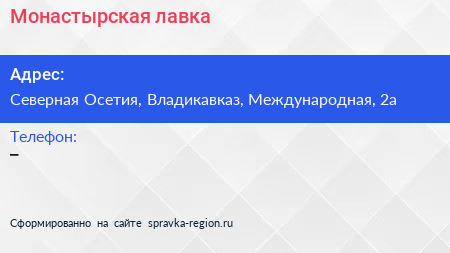 Монастырская лавка по адресу Северная Осетия, Владикавказ, Международная, 2а в дальнейшем Организация, размещена в следующих категориях: