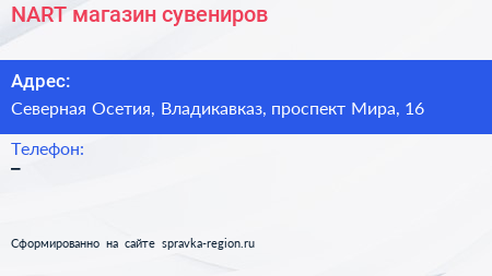 NART, магазин сувениров по адресу Северная Осетия, Владикавказ, проспект Мира, 16 в дальнейшем Организация, размещена в следующих категориях: