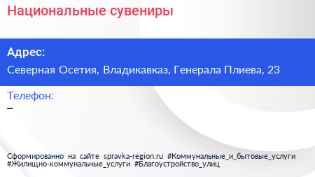 Национальные сувениры по адресу Северная Осетия, Владикавказ, Генерала Плиева, 23 в дальнейшем Организация, размещена в следующих категориях: