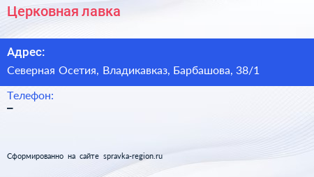 Церковная лавка по адресу Северная Осетия, Владикавказ, Барбашова, 38/1 в дальнейшем Организация, размещена в следующих категориях: