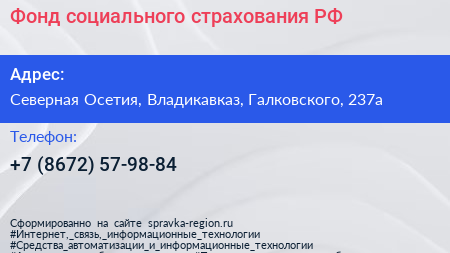 Фонд cоциального cтрахования РФ по адресу Северная Осетия, Владикавказ, Галковского, 237а в дальнейшем Организация, размещена в следующих категориях: