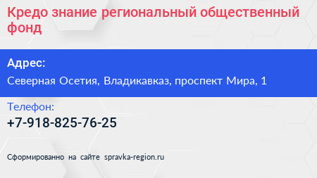 Кредо-знание, региональный общественный фонд по адресу Северная Осетия, Владикавказ, проспект Мира, 1 в дальнейшем Организация, размещена в следующих категориях: