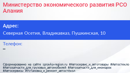 Министерство экономического развития РСО-Алания по адресу Северная Осетия, Владикавказ, Пушкинская, 10 в дальнейшем Организация, размещена в следующих категориях:
