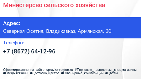 Министерсво сельского хозяйства по адресу Северная Осетия, Владикавказ, Армянская, 30 в дальнейшем Организация, размещена в следующих категориях: